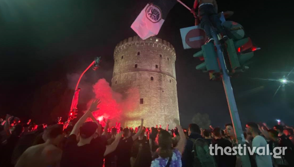 Όπως μπορείτε να δείτε και στα βίντεο του GRTimes.gr και του Thesstoday.gr, οι φίλαθλοι με μία μπύρα στο χέρι και ντυμένοι στα ασπρόμαυρα μαζεύτηκαν στον Λευκό Πύργο και άναψαν φωτιές στην Καμάρα φωνάζοντας συνθήματα.