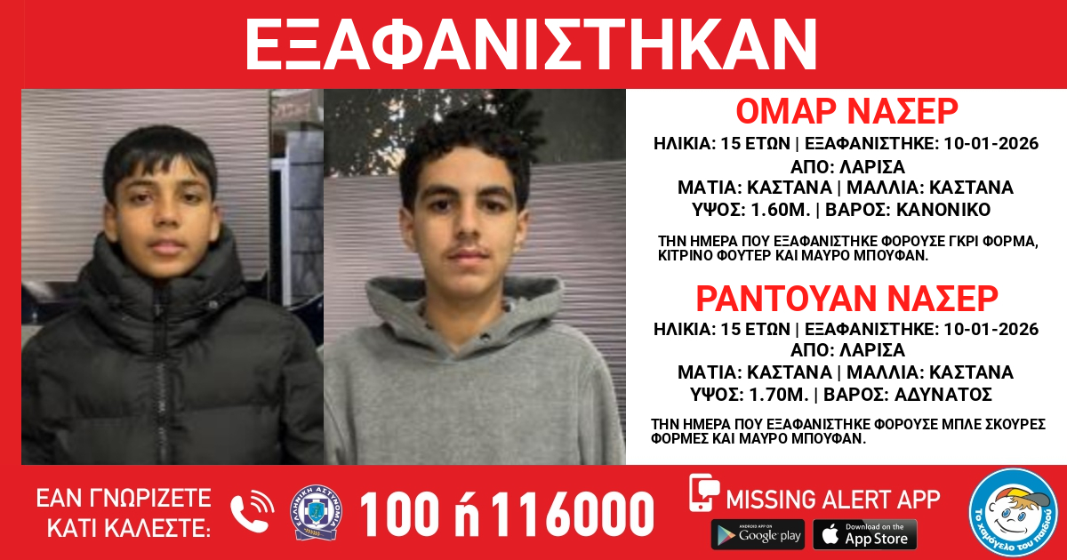 Σύμφωνα με το Χαμόγελο του Παιδιού, στις 10/1/2026, στις 20.00 η ώρα, σημειώθηκε η εξαφάνιση του Radwan (ον) Naser (επ) και ο Οmar (ον) Νaser 15 ετών, αιγυπτιακής καταγωγής από χώρο φιλοξενίας ασυνόδευτων ανηλίκων.