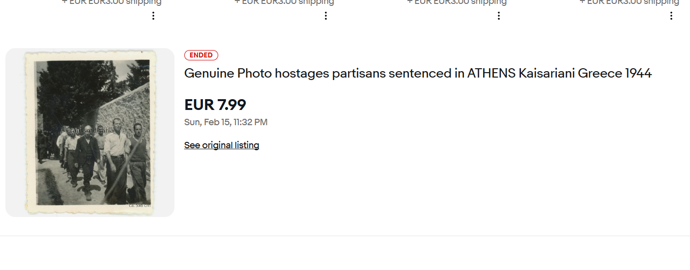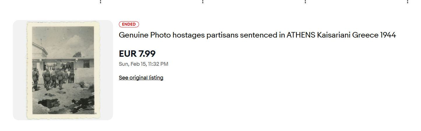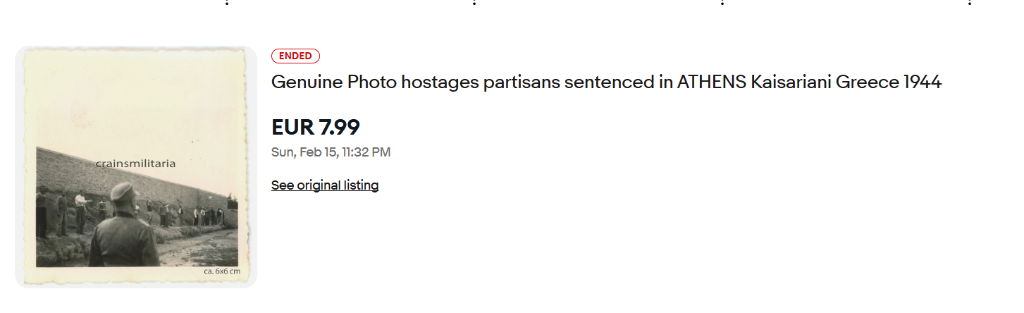 Διεκόπη το πρωί της Δευτέρας 16/2 η δημοπρασία στο eBay για τις φωτογραφίες ντοκουμέντα που αφορούν τις τελευταίες στιγμές κάποιων εκ των 200 αντιστασιακών που εκτελέστηκαν την Πρωτομαγιά του 1944 στην Καισαριανή.