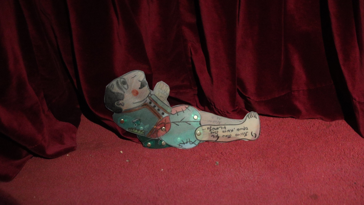 Στο φέρετρο τοποθετήθηκε και μία φιγούρα του Καραγκιόζη που γράφει επάνω «Κείνο που με τρώει, κείνο που με σώζει…».