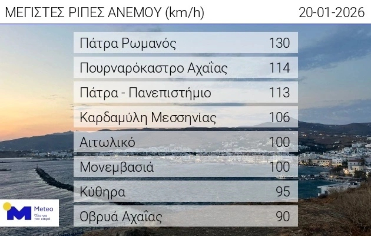 Οι άνεμοι έφτασαν και ξεπέρασαν τα 100 χιλιόμετρα την ώρα στον Ρωμανό (130 χλμ/ώρα), Πουρναρόκαστρο (114 χλμ/ώρα), στην Πανεπιστημιούπολη του Ρίου (113 χλμ/ώρα), Καρδαμύλη Μεσσηνίας (106 χλμ/ώρα), καθώς και στο Αιτωλικό και τη Μονεμβασιά (100 χλμ/ώρα).