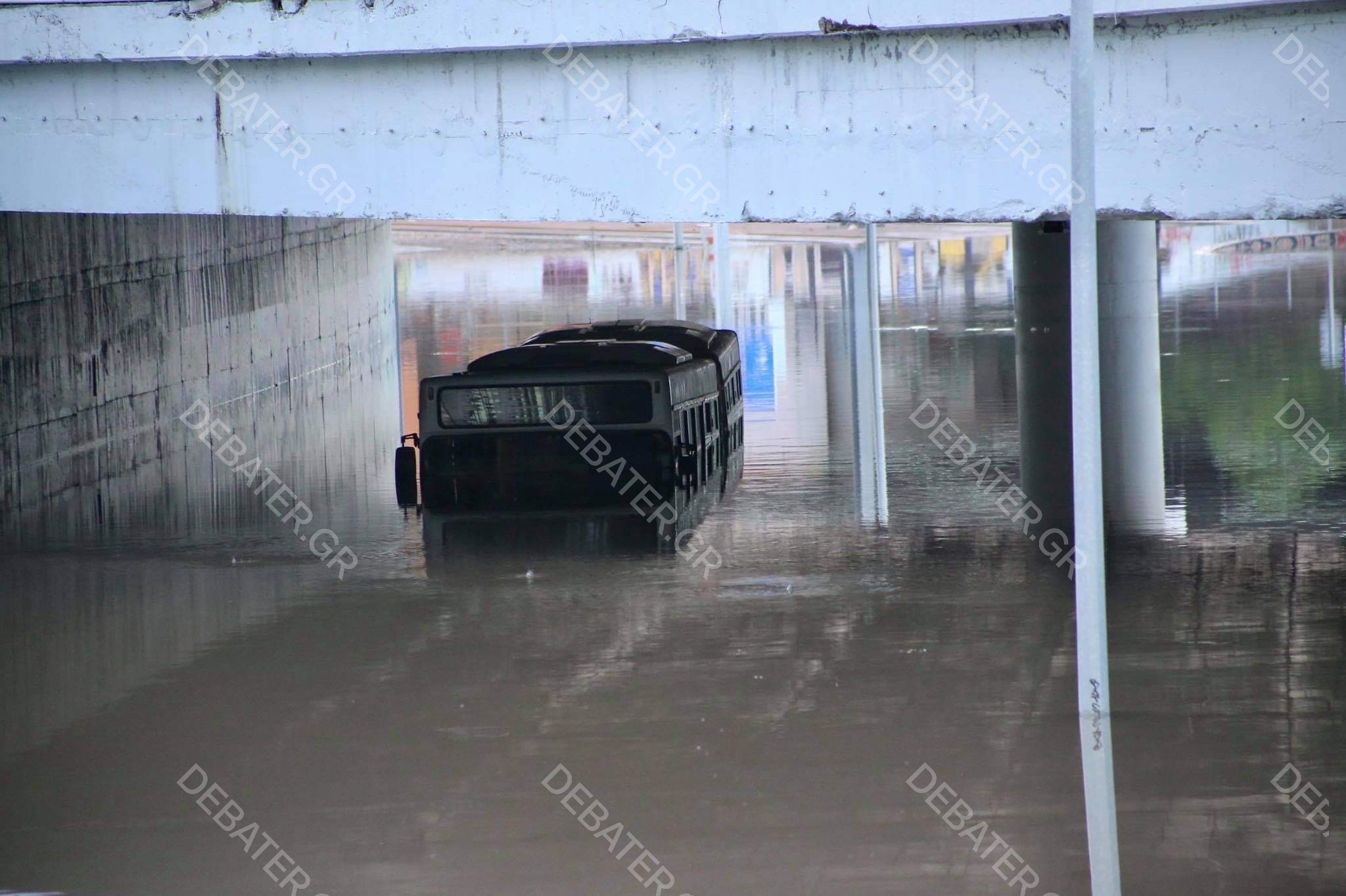 Το λεωφορείο εκτελούσε το δρομολόγιο Πειραιάς-Βούλα και λόγω του όγκου νερού άρχισε να “βυθίζεται” κυριολεκτικά, με αποτέλεσμα να εγκλωβιστούν οι επιβάτες και να αναγκαστούν να το εγκαταλείψουν.