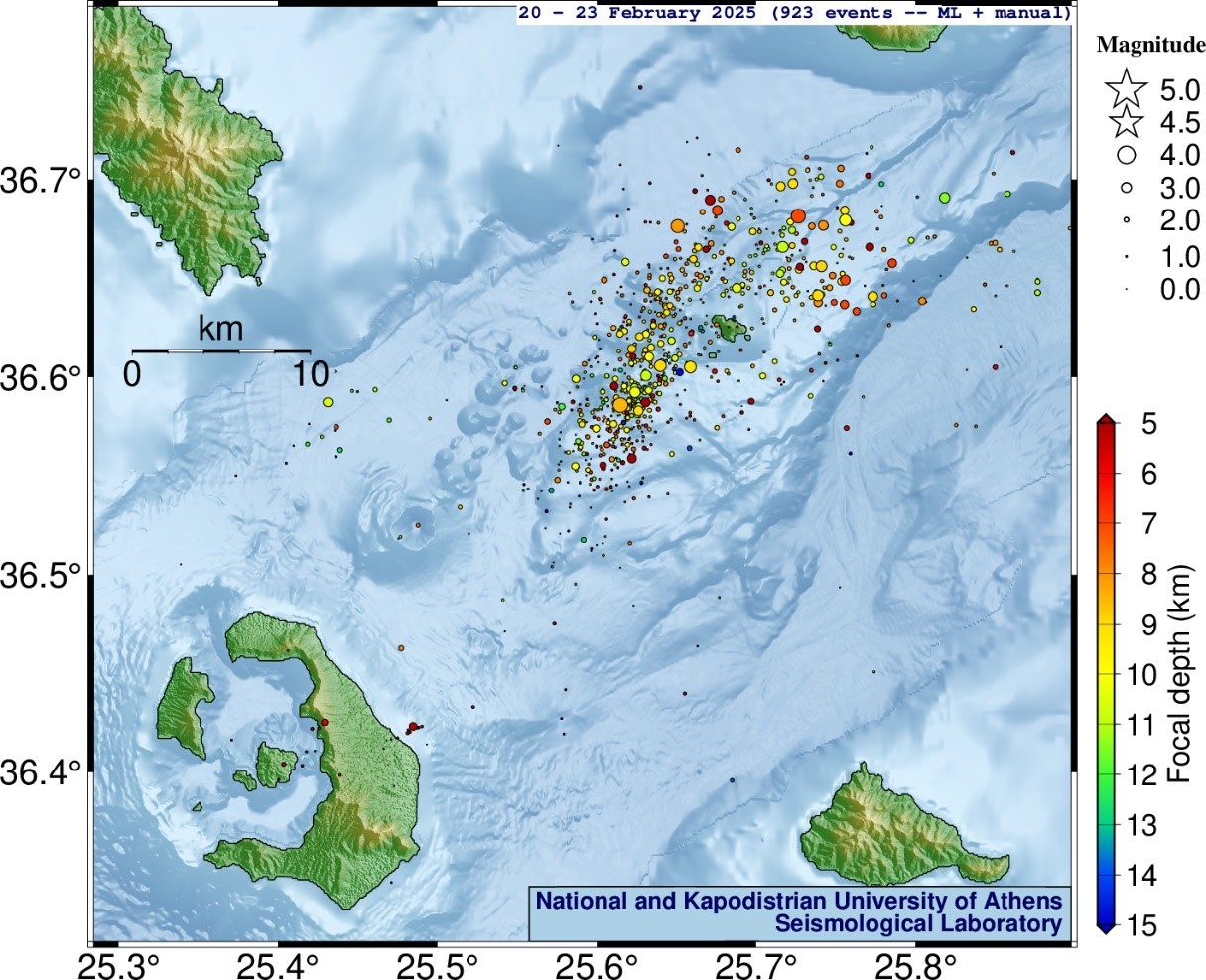 Από την έναρξη της σεισμικής δραστηριότητας στη ζώνη Σαντορίνης-Αμοργού στις 26 Ιανουαρίου έως και τις 22 Φεβρουαρίου 2025, το Εργαστήριο Σεισμολογίας (ΕΣ) του ΕΚΠΑ (http://dggsl.geol.uoa.gr/) έχει ανιχνεύσει και εντοπίσει συνολικά, με αυστηρά κριτήρια για τη διασφάλιση της ποιότητας των αποτελεσμάτων, πάνω από 23,500 σεισμούς με μεθόδους μηχανικής μάθησης (τεχνητής νοημοσύνης), εκ των οποίων άνω των 20,000 με μεγέθη Μ≥1.0. Στις 20 Φεβρουαρίου καταγράφηκαν πάνω από 270 σεισμοί, με 17 να έχουν μέγεθος Μ≥2.5, και κανέναν (0) σεισμό με Μ≥4.0, με τον ισχυρότερο σεισμό, μεγέθους 3.7, να σημειώνεται στις 22:09:53 UTC (00:09:53 της 21ης Φεβρουαρίου, τοπική ώρα). Στις 21 Φεβρουαρίου καταγράφηκαν πάνω από 280 σεισμοί, με 18 να έχουν μέγεθος Μ≥2.5, και κανέναν (0) σεισμό με Μ≥4.0, με τον ισχυρότερο σεισμό μεγέθους 3.5 να σημειώνεται στις 04:57:34 (τοπική ώρα). Στις 22 Φεβρουαρίου καταγράφηκαν πάνω από 300 σεισμοί, με 12 να έχουν μέγεθος Μ≥2.5, και κανέναν (0) σεισμό με Μ≥4.0, με τον ισχυρότερο σεισμό μεγέθους 3.3 να σημειώνεται στις 14:54:27 (τοπική ώρα). Σύμφωνα με τα στοιχεία καθημερινής ανάλυσης σεισμικών δεδομένων (χωρίς χρήση μεθόδων μηχανικής μάθησης) του Εργαστηρίου Σεισμολογίας του ΕΚΠΑ, κατά την 23η Φεβρουαρίου έχουν καταγραφεί 61 σεισμοί, εκ των οποίων κανένας (0) με μέγεθος M≥4.0, με τον ισχυρότερο σεισμό, μεγέθους 3.6, να σημειώνεται στις 17:26:21 (τοπική ώρα).