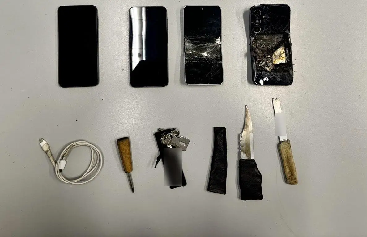 Συγκεκριμένα, έγιναν έρευνες σε 16 κελιά, και βρέθηκαν δυο μαχαίρια, αυτοσχέδιο σουβλί, -4- κινητά τηλέφωνα, φορτιστής κινητών τηλεφώνων, κρίκος με -3- κλειδιά, καθώς και ιδιόχειρες σημειώσεις.