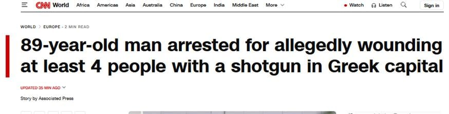 Ο τίτλος του CNN είναι: «89χρονος άνδρας συνελήφθη επειδή φέρεται να τραυμάτισε τουλάχιστον 4 άτομα με καραμπίνα στην ελληνική πρωτεύουσα». Έπειτα το δημοσίευμα αναφέρει ότι: «Η ένοπλη βία είναι σχετικά σπάνια στην Ελλάδα, όπου η κατοχή πυροβόλων όπλων επιτρέπεται αλλά ρυθμίζεται αυστηρά».