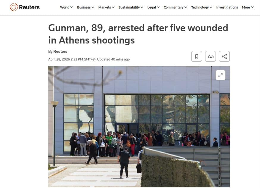 Το Reuters αναφέρει: «Ένοπλος, 89 ετών, συνελήφθη μετά τον τραυματισμό πέντε ατόμων σε πυροβολισμούς στην Αθήνα» και στο ρεπορτάζ του καταγράφει το χρονικό των επιθέσεων.