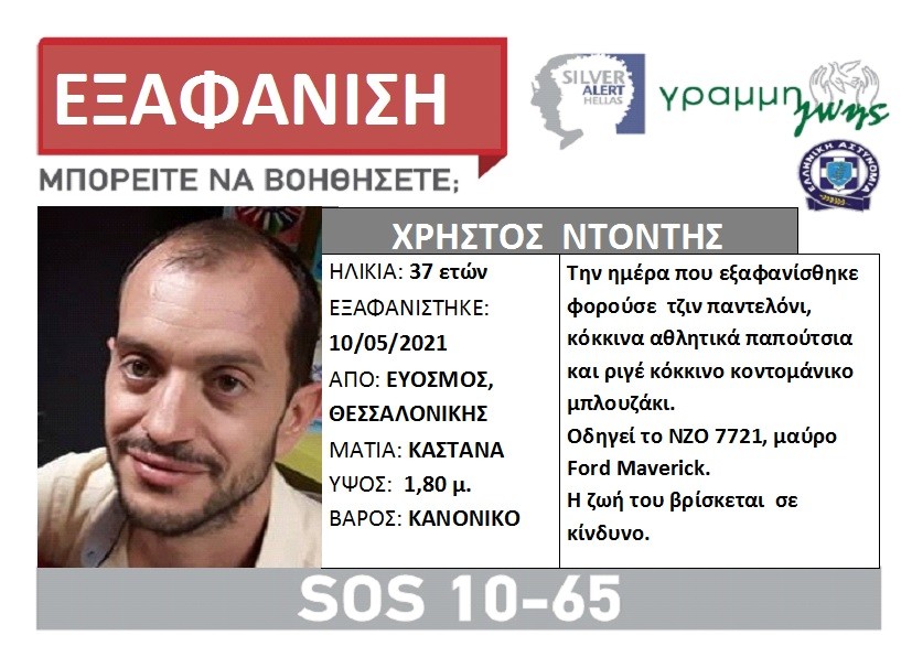 Πρόκειται για τον Χρήστο Ντόντη, ο οποίος εξαφανίστηκε το πρωί της Δευτέρας από το σπίτι του, στον Εύοσμο. Έχει καστανά μάτια, ύψος 1,80μ και είναι κανονικού βάρους. Τη δήλωση εξαφάνισής του έκανε συγγενικό του πρόσωπο.