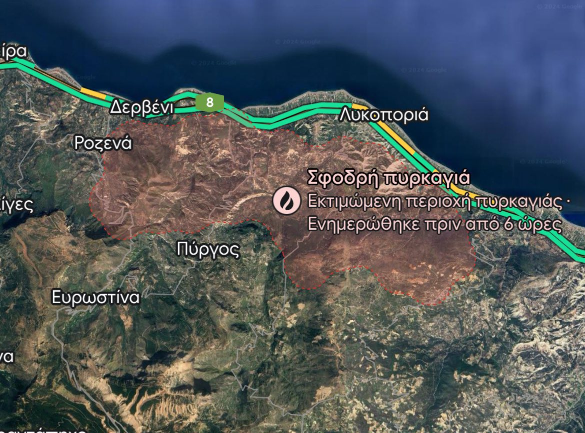 Σύμφωνα με αναφορές, αργά χθες το βράδυ οι φλόγες έφτασαν μέσα στο χωριό Ελληνικό και υπάρχουν πληροφορίες ότι κάηκαν σπίτια, ενώ λόγω των ισχυρών βορειοδυτικών ανέμων ο πυκνός καπνός από την πύρινη κόλαση έχει φτάσει μέχρι την Κόρινθο.