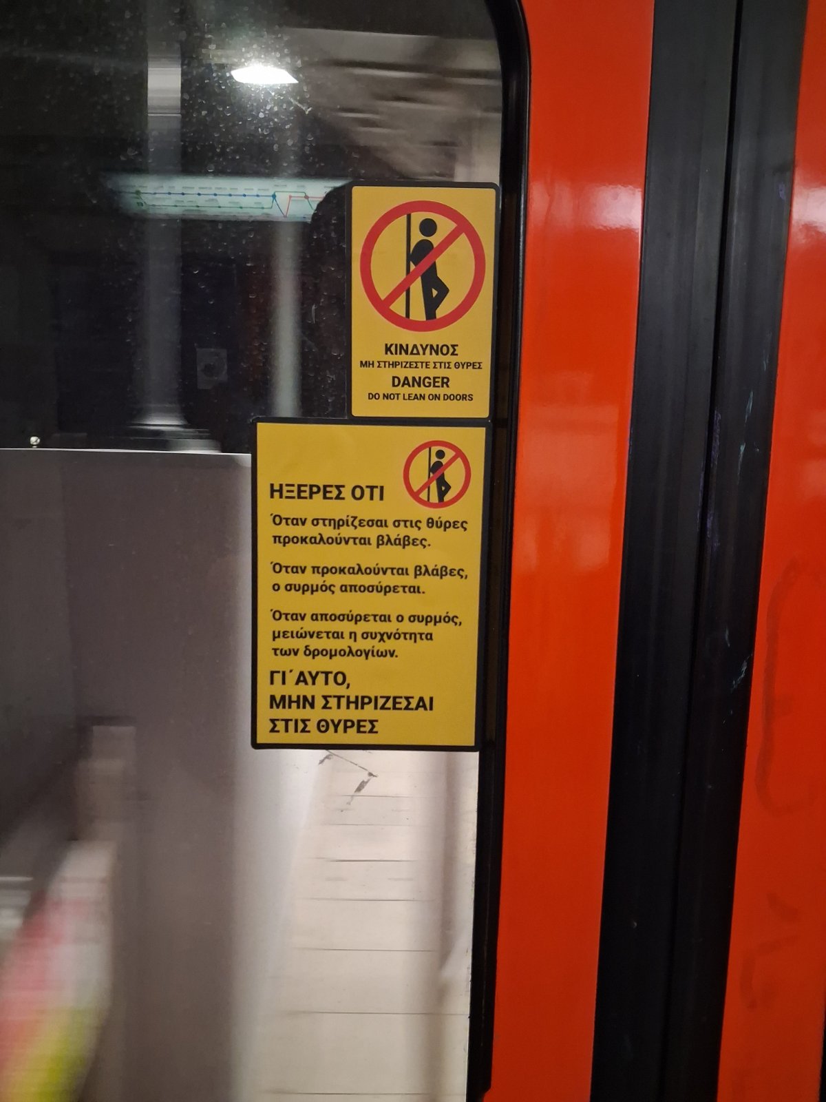 Μάλιστα, με μία ευφάνταστη σημείωση στο εσωτερικό των συρμών, ο ΗΣΑΠ καλεί τους πολίτες να μην αγγίζουν τις πόρτες της αποβάθρας, γιατί αυτό μπορεί να προκαλέσει δυσλειτουργία και συνεπώς καθυστερήσεις και ταλαιπωρία για τους επιβάτες.