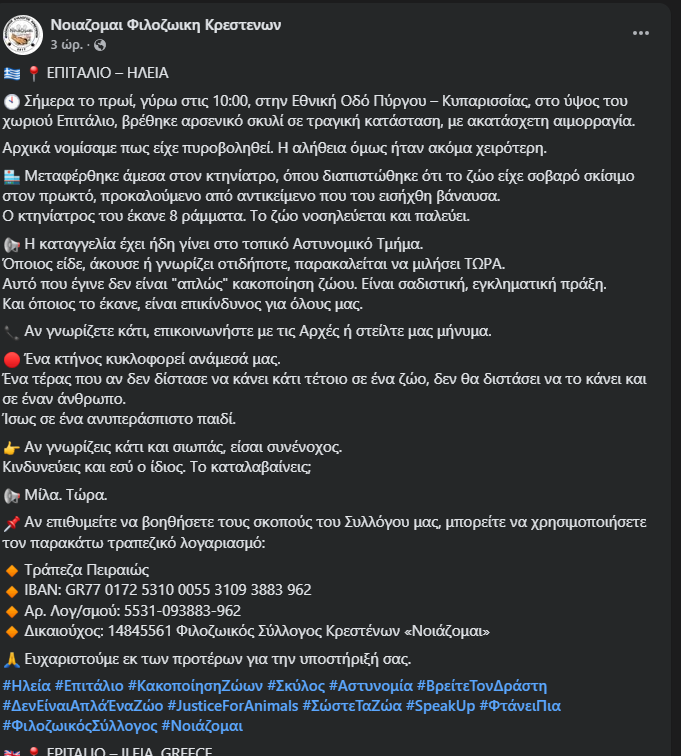 «Αυτό που έγινε δεν είναι “απλώς” κακοποίηση ζώου. Είναι σαδιστική, εγκληματική πράξη. Και όποιος το έκανε, είναι επικίνδυνος για όλους μας. Αν γνωρίζετε κάτι, επικοινωνήστε με τις Αρχές ή στείλτε μας μήνυμα. Ένα κτήνος κυκλοφορεί ανάμεσά μας.