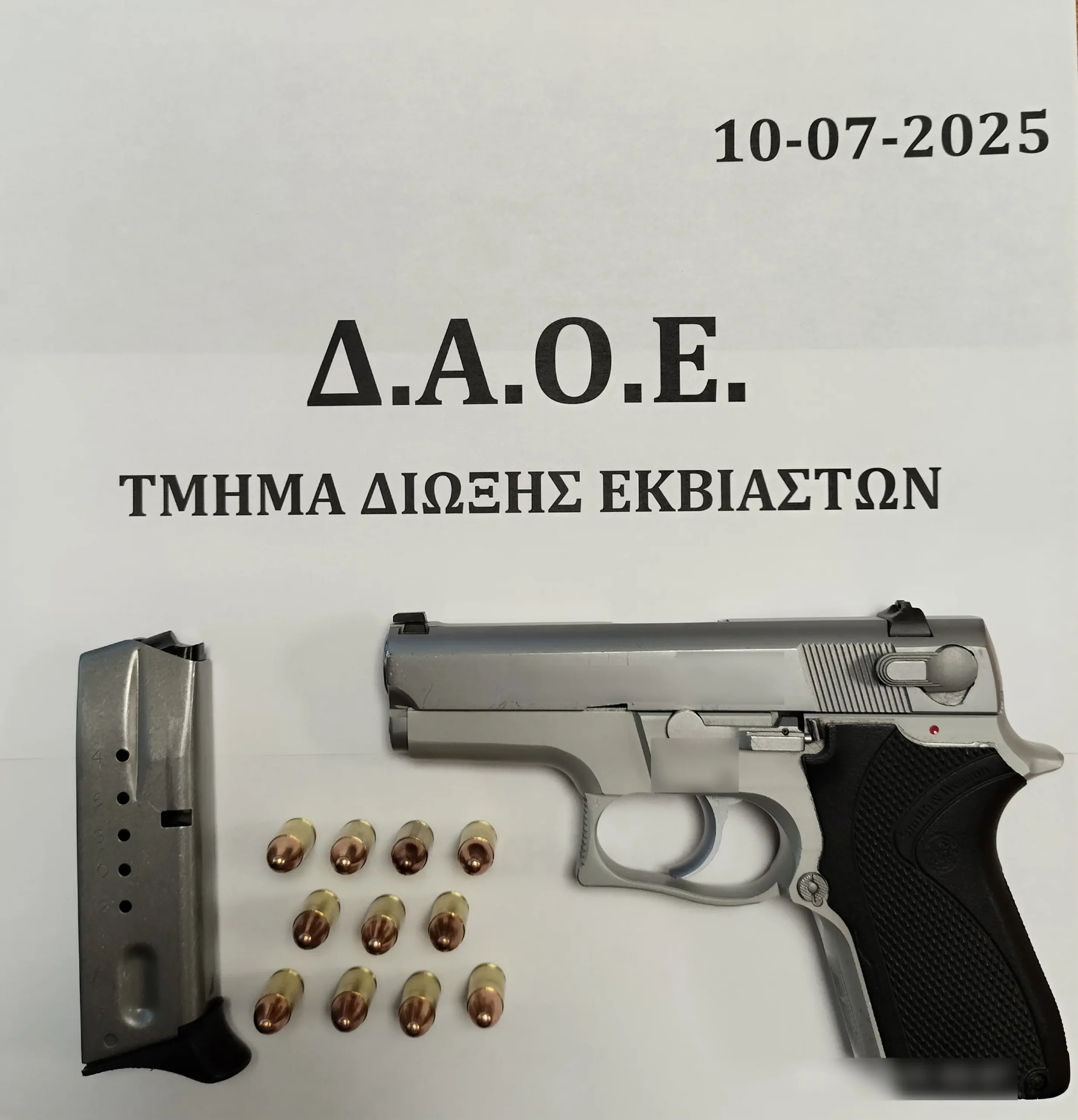 Ειδικότερα, ο κατηγορούμενος εντοπίσθηκε στο πλαίσιο ελέγχων που διενεργούσαν αστυνομικοί του Τμήματος Δίωξης Εκβιαστών να φέρει, εντός τσάντας, πιστόλι με γεμιστήρα με -11- φυσίγγια. Επιπλέον, από την κατοχή του κατασχέθηκαν -2- κινητά τηλέφωνα.