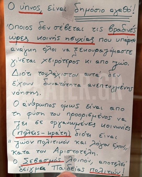 Αντί για μια τυπική υπενθύμιση, ο ένοικος επέλεξε έναν πιο… φιλοσοφημένο τρόπο έκφρασης. Με χειρόγραφο σημείωμα, που κόλλησε σε εμφανές σημείο μέσα στο ασανσέρ, δεν δίστασε να χρησιμοποιήσει έντονη γλώσσα αλλά και αναφορές στην αρχαία ελληνική σκέψη, θέλοντας να δώσει μεγαλύτερο βάρος στο μήνυμά του.