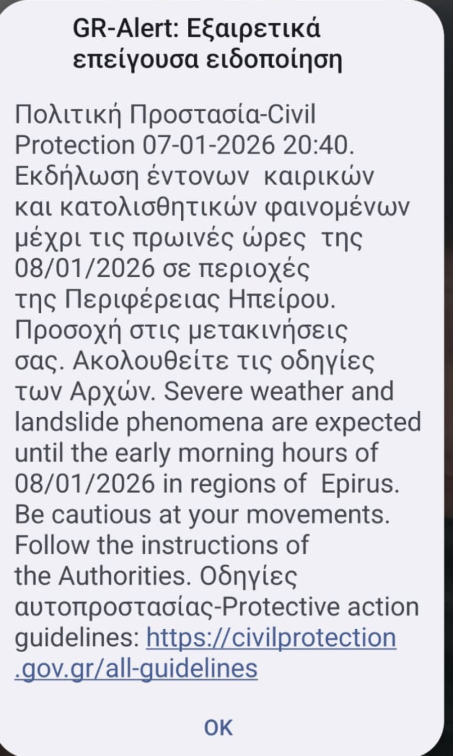Συγκεκριμένα, το βράδυ της Τετάρτης 7/1 ήχησε το 112 σε περιοχές της Περιφέρειας Ηπείρου λόγω εκδήλωσης έντονων καιρικών και κατολισθητικών φαινομένων μέχρι τις πρωινές ώρες της Πέμπτης 8/1. «Προσοχή στις μετακινήσεις σας. Ακολουθείτε τις οδηγίες των Αρχών» αναφέρει το μήνυμα.