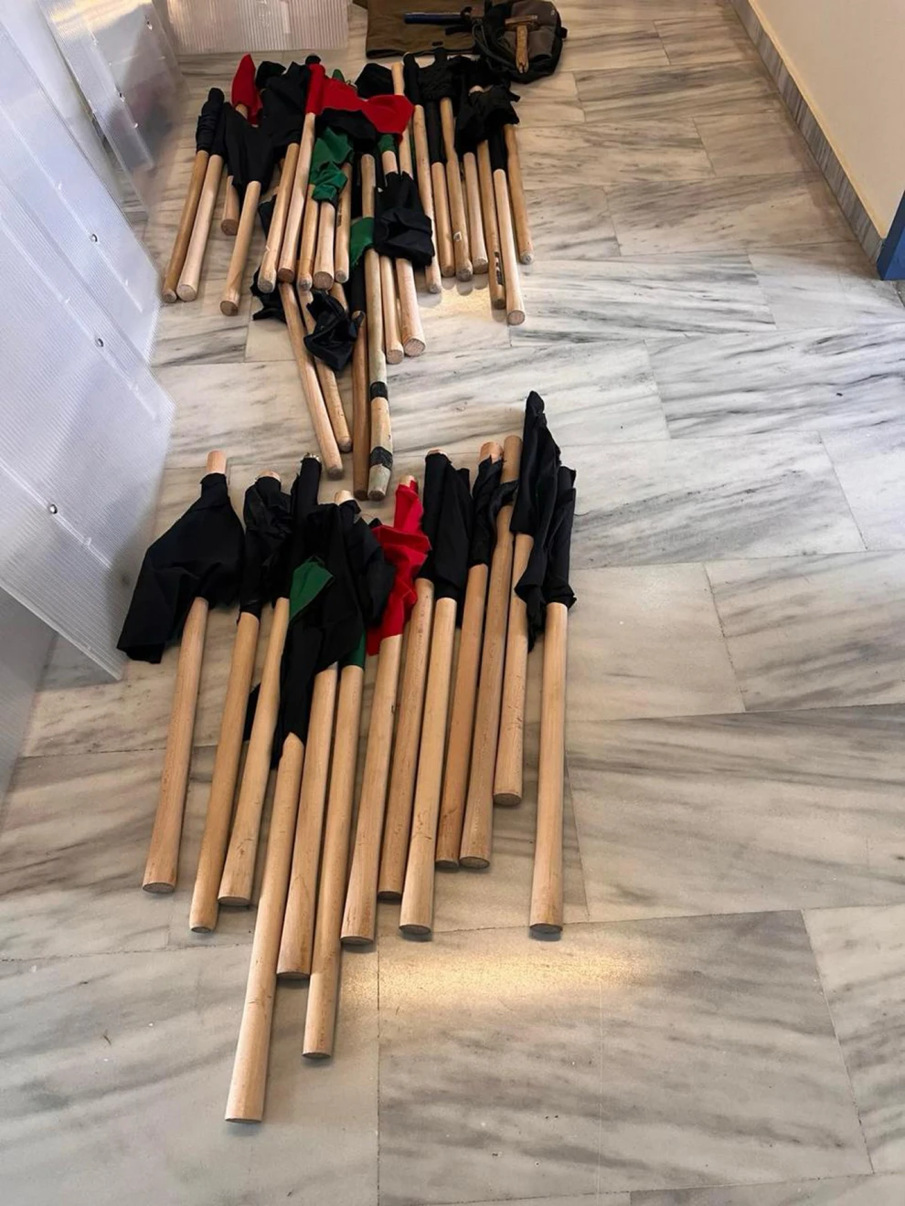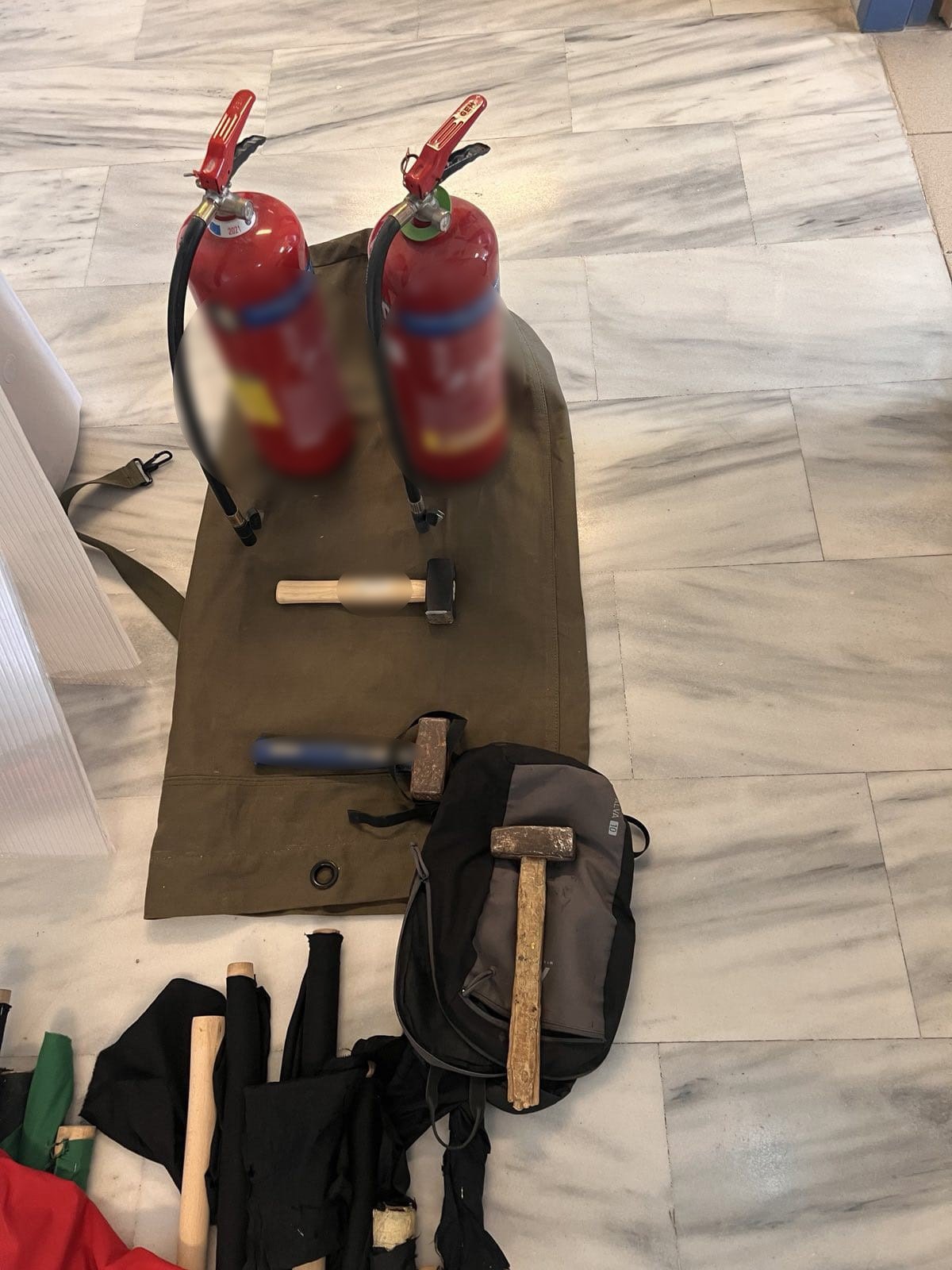 Μεταξύ άλλων, στις έρευνες των αστυνομικών βρέθηκαν ρόπαλα, αντιασφυξιογόνες μάσκες, ασπίδες, πυροσβεστήρες.