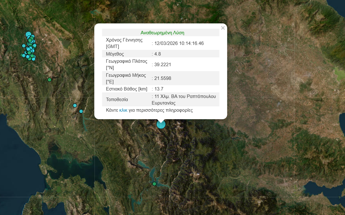Σεισμός μεγέθους 4,8 βαθμών της κλίμακας Ρίχτερ σημειώθηκε στις 12:14 το μεσημέρι της Πέμπτης 12/3 στην Ευρυτανία.
