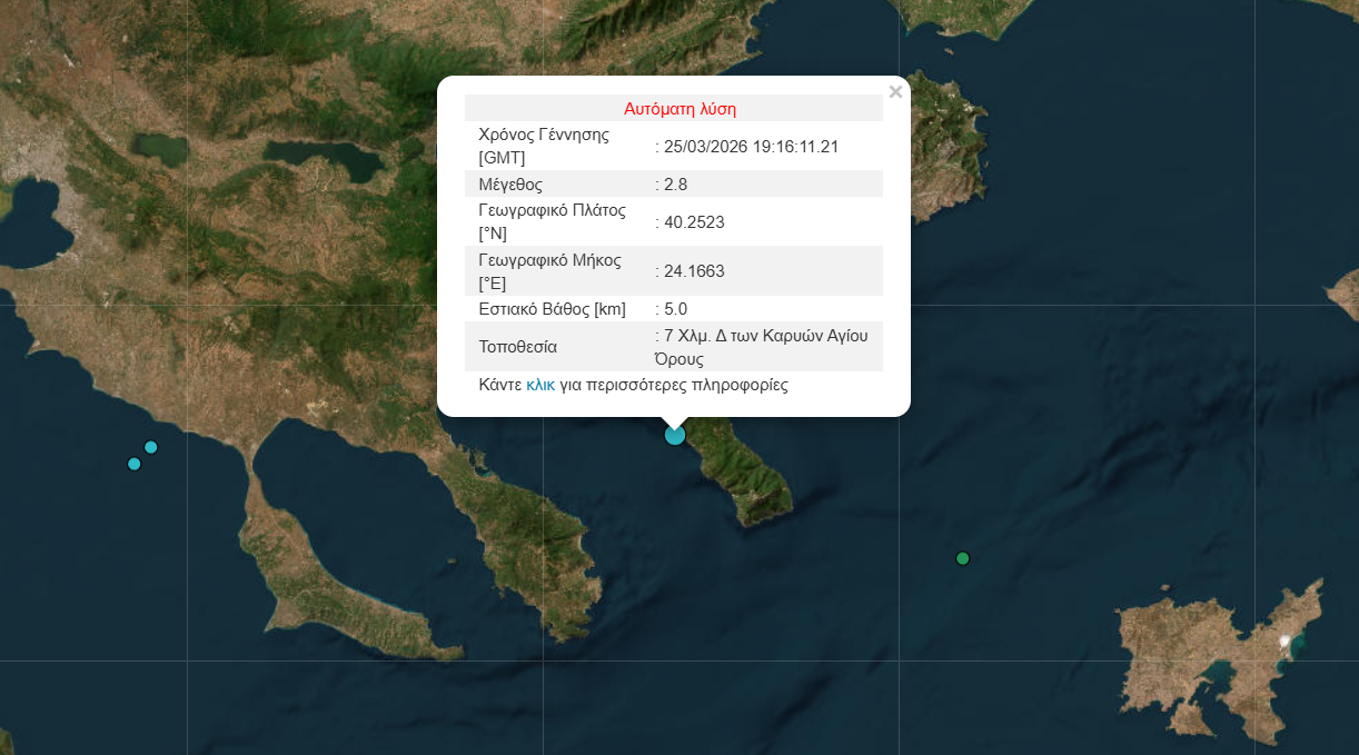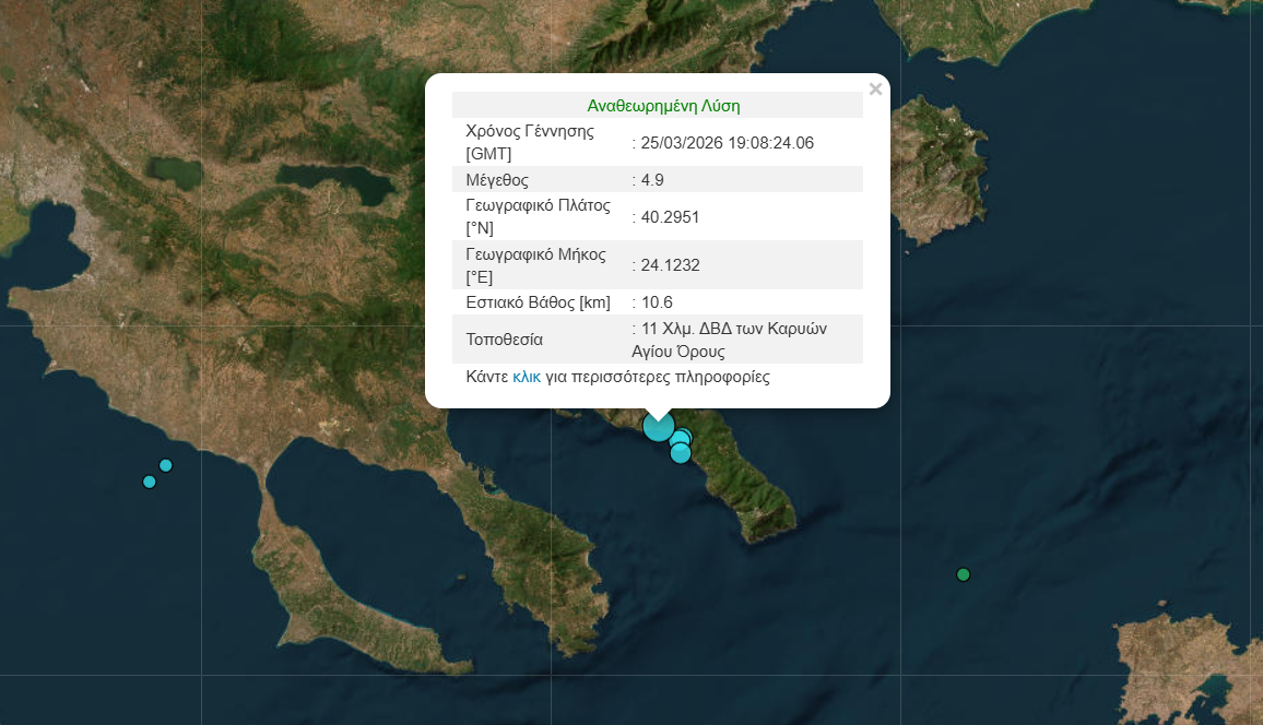 Ισχυρή σεισμική δόνηση μεγέθους 4,9 βαθμών της κλίμακας Ρίχτερ σημειώθηκε το απόγευμα της Τετάρτης (25.03) στο Άγιο Όρος.