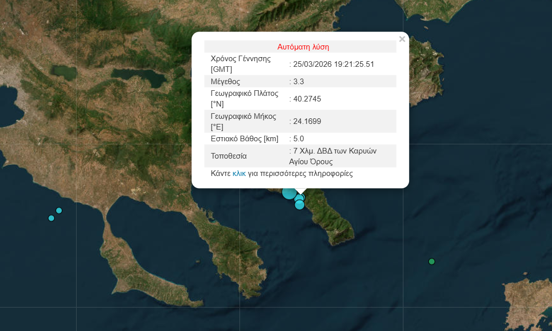 Σύμφωνα με το γεωδυναμικό ινστιτούτο, το επίκεντρο της δόνησης εντοπίζεται 11 χλμ. ΔΒΔ των Καρυών του Αγίου Όρους και το εστιακό βάθος υπολογίζεται στα 10,6 χιλιόμετρα.