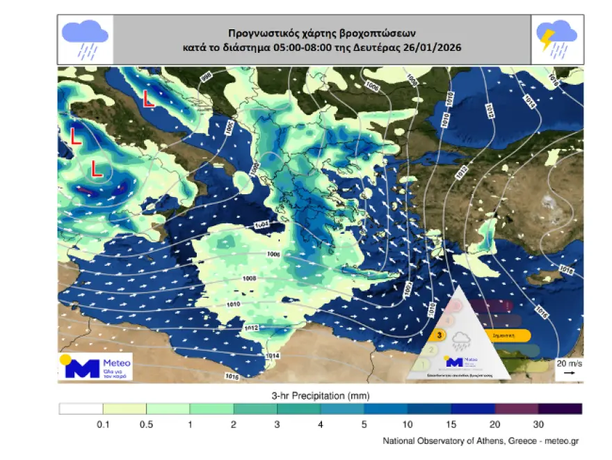 Σύμφωνα με τα διαθέσιμα προγνωστικά στοιχεία του Εθνικού Αστεροσκοπείου Αθηνών / Meteo.gr, τη Δευτέρα 26/01 αναμένεται επεισόδιο βροχόπτωσης Κατηγορίας 3 (Σημαντική), με βροχές και καταιγίδες τοπικά ισχυρές.