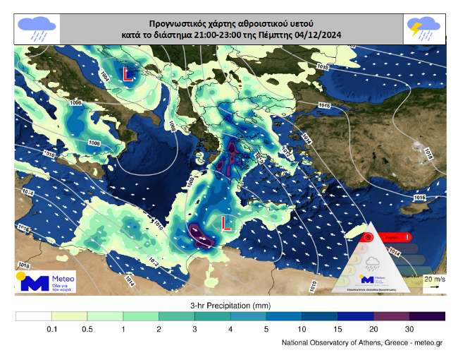 Ισχυρές βροχές και καταιγίδες προβλέπονται στην κεντρική Μακεδονία, τη Θεσσαλία, τις Σποράδες, την ανατολική Στερεά (συμπεριλαμβανομένης της Αττικής κυρίως στα νότια και ανατολικά τμήματα), την Εύβοια, τις Κυκλάδες, την Κρήτη, τα νησιά του Ανατολικού Αιγαίου (από ν. Χίο και νοτιότερα), τα Δωδεκάνησα και την ανατολική και νότια Πελοπόννησο. Τα φαινόμενα θα είναι κατά διαστήματα ιδιαιτέρως ισχυρά και δυνητικά επικίνδυνα (κόκκινη ΠΡΟΕΙΔΟΠΟΊΗΣΗ): στις περειφερειακές ενότητες Πιερίας – Ημαθίας – Χαλκιδικής – Θεσσαλονίκης, στη Θεσσαλία, στις Σποράδες, την Εύβοια, τα νησιά του ανατολικού Αιγαίου και τα Δωδεκάνησα και κατά τόπους στις Κυκλάδες και την Κρήτη. Στην υπόλοιπη χώρα άστατος καιρός κατά περιόδους νεφελώδης με τοπικές βροχές και σποραδικές καταιγίδες. Τοπικές χιονοπτώσεις θα σημειωθούν στα ορεινά της κεντρικής, της δυτικής Μακεδονίας και της Ηπείρου.