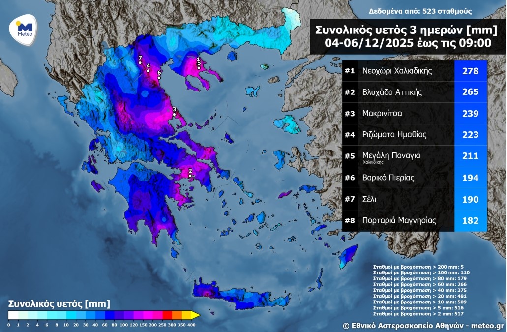 Πάνω από 200 χιλιοστά βροχής κατέγραψαν πέντε περιοχές της Ελλάδας, ανάμεσά τους και η Βλυχάδα Αττικής, από τις 4 Δεκεμβρίου 2025 έως σήμερα το πρωί, σύμφωνα με το δίκτυο σταθμών του meteo.gr / Εθνικού Αστεροσκοπείου Αθηνών.