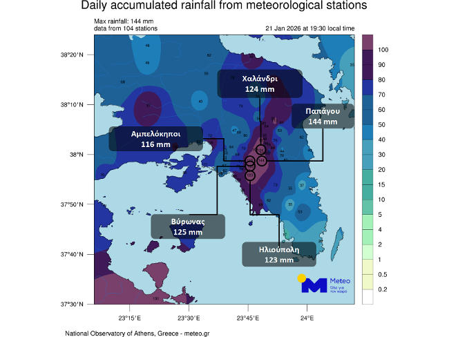 Πολύ μεγάλα ύψη βροχής καταγράφηκαν χθες Τετάρτη 21/1 στην Αττική, την Ανατολική Πελοπόννησο, την Εύβοια, αλλά και σε άλλες περιοχές της χώρας, λόγω της κακοκαιρίας.