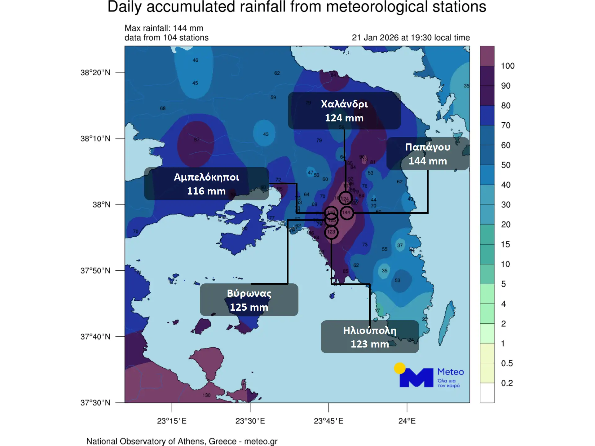 Όπως προκύπτει από το δίκτυο αυτόματων μετεωρολογικών σταθμών του Meteo, τα μεγαλύτερα ύψη βροχής έως τις 20:00 καταγράφηκαν στον Παπάγο Αττικής, όπου έπεσαν 146,4 χιλιοστά βροχής. Ακολουθούν η Τακτικούπολη Τριζηνίας με 130,4 χιλιοστά, ο Βύρωνας Αττικής με 126,4 χιλιοστά, το Χαλάνδρι με 125,8 χιλιοστά, η Ηλιούπολη με 124,4 χιλιοστά και η περιοχή του Νομισματοκοπείου με 123 χιλιοστά.