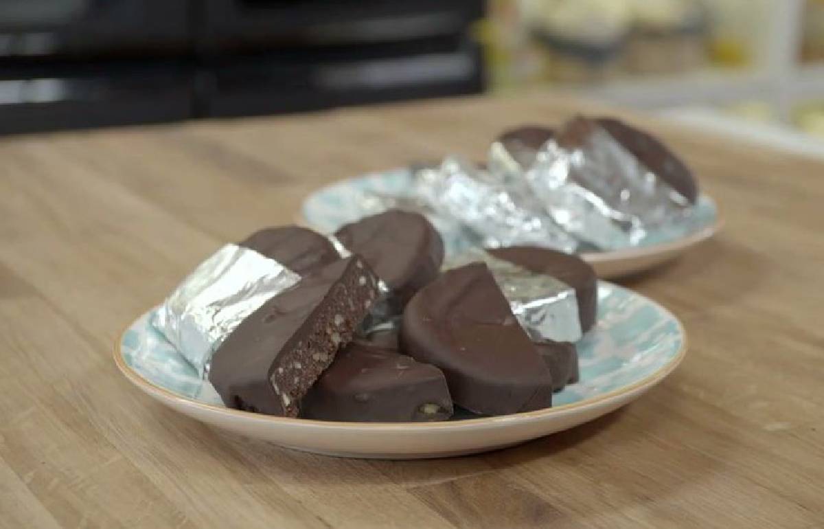 Σε μία λαδόκολλα τοποθετούμε μία μεμβράνη, προσθέτουμε το μείγμα μας, το τυλίγουμε σε ρολό και το τοποθετούμε στο ψυγείο για τρεις – τέσσερις ώρες.