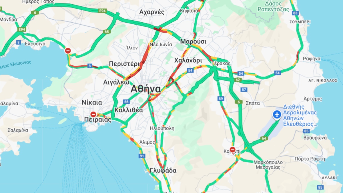 Στον Κηφισό έχουν σχηματιστεί ουρές χιλιομέτρων στην άνοδο λόγω τροχαίου στο ύψος του Περιστερίου. Η κίνηση ξεκινά από το ύψος της λεωφόρου Αθηνών και φτάνει έως και τη Νέα Φιλαδέλφεια. Οι δρόμοι γύρω από τον Πειραιά και το κέντρο της Αθήνας είναι «κόκκινοι»