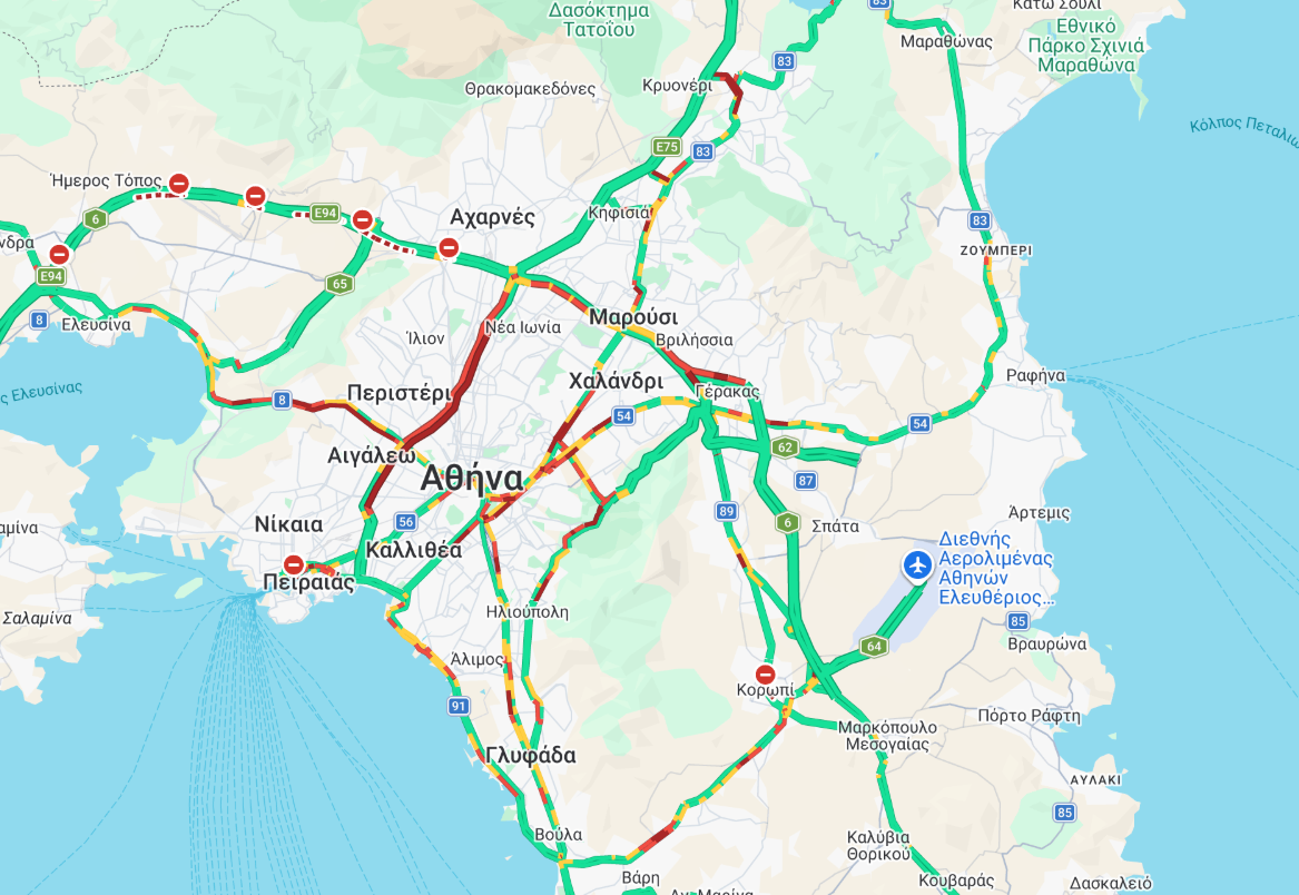 Τα μεγαλύτερα προβλήματα εντοπίζονται στον Κηφισό καθώς η ροή της κίνησης των οχημάτων διεξάγεται με εξαιρετικά χαμηλές ταχύτητες. Σοβαρά ζητήματα παρατηρούνται στη λεωφόρο Αθηνών από τον Ελαιώνα μέχρι τις Τρεις Γέφυρες, ενώ με μεγάλες καθυστερήσεις διεξάγεται η κυκλοφορία στη λεωφόρο Αθηνών στο ρεύμα προς Κόρινθο από το Χαϊδάρι μέχρι τα ναυπηγεία του Σκαραμαγκά.
