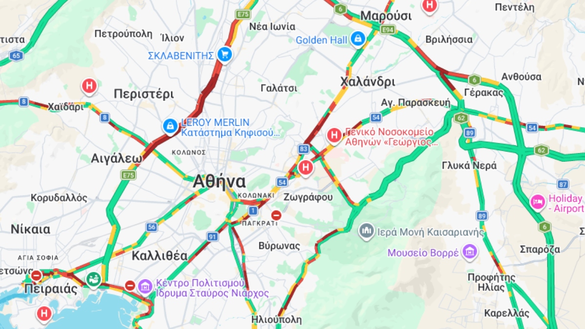 Στο “κόκκινο” είναι η κυκλοφορία και στα δύο ρεύματα της Κηφισίας, όπως επίσης και στη λεωφόρο Αθηνών, αλλά και στους δρόμους γύρω από το λιμάνι του Πειραιά.