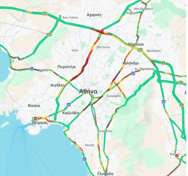 Την ίδια ώρα, αυξημένη κίνηση παρατηρείται στη Μεσογείων, στο ρεύμα προς Αθήνα, από την Αγία Παρασκευή έως την Κατεχάκη, στην Κηφισίας από Κατεχάκη έως Χαλάνδρι, καθώς και στη Λεωφόρο Αθηνών, από το Χαϊδάρι έως τον Σκαραμαγκά.