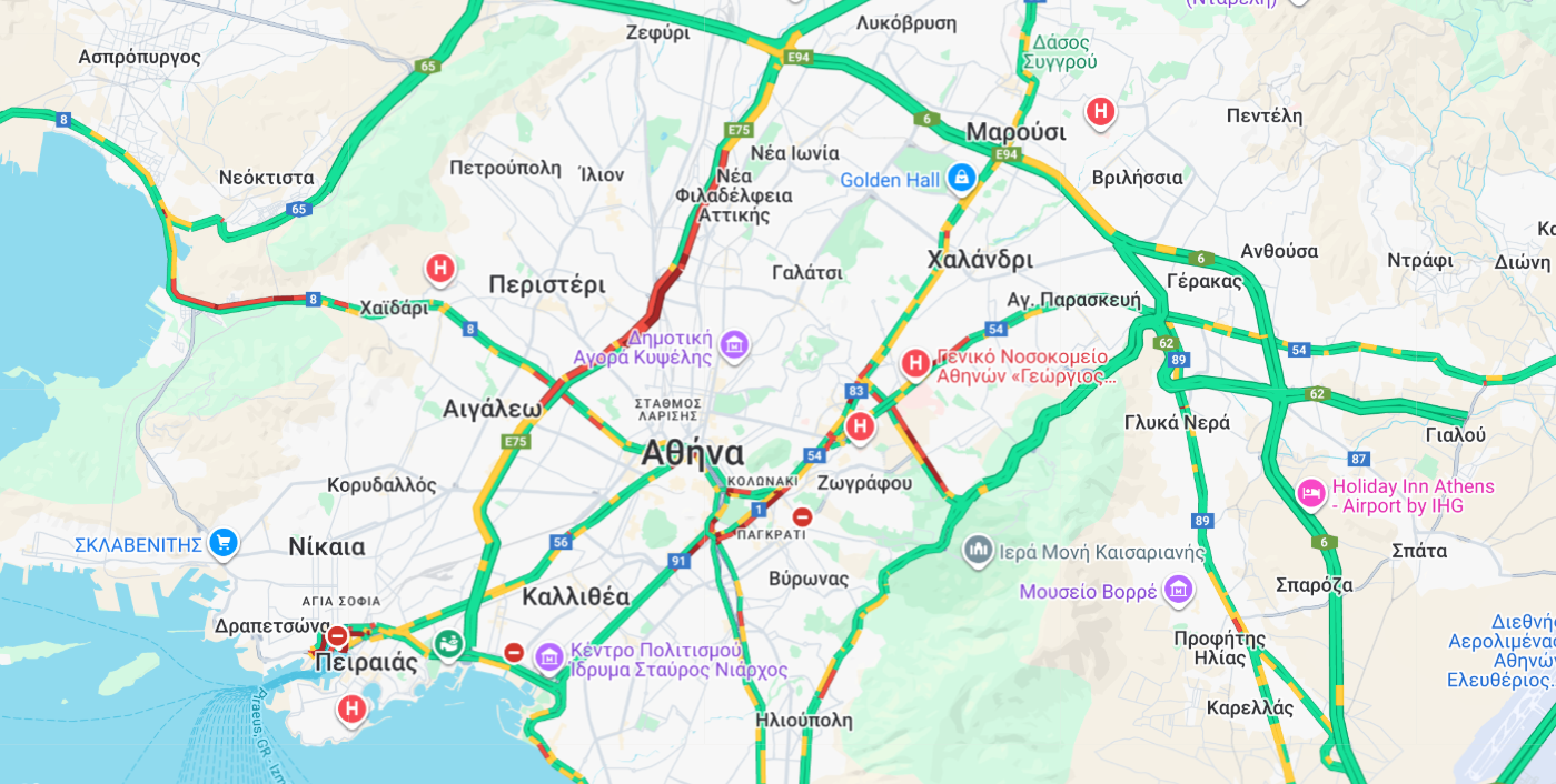 Ειδικότερα, αυξημένη κίνηση παρατηρείται στα δύο ρεύματα του Κηφισού, στην Αλίμου Κατεχάκη, στην Βασιλίσσης Σοφίας, στην Βασιλέως Κωνσταντίνου, στην Συγγρού και την Λεωφόρο Αθηνών.