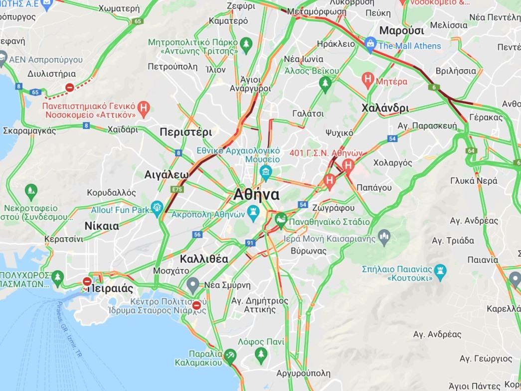 Μποτιλιάρισμα υπάρχει αυτή την ώρα και στα δυο ρεύματα της Λ. Κηφισού, την Κηφισίας και στα δυο ρεύματα, τη Μεσογείων, την Περιφερειακή Υμηττού και γύρω από το λιμάνι του Πειραιά.