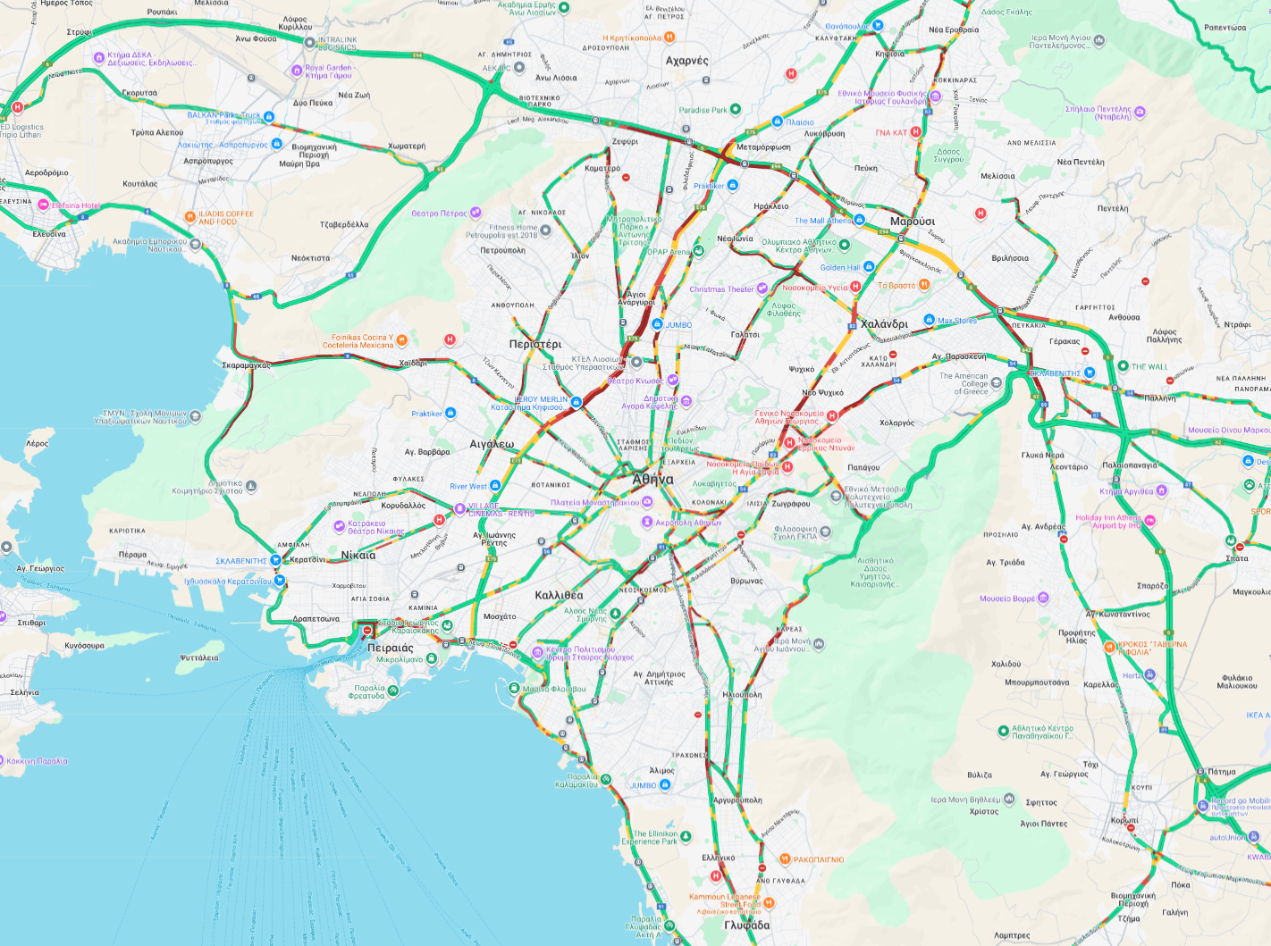 Επίσης, με χαμηλές ταχύτητες κινούνται οι οδηγοί και στη λεωφόρο Αθηνών, από το Χαϊδάρι έως τον Σκαραμαγκά, καθώς και στην παραλιακή στο ύψος του Αλίμου, αλλά και στους δρόμους γύρω από το λιμάνι του Πειραιά.
