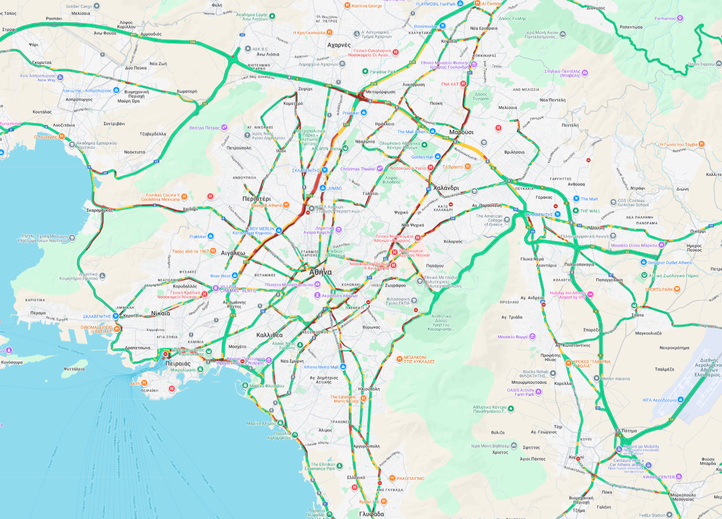 Με χαμηλές ταχύτητες κινούνται οι οδηγοί και στην Κηφισίας και ιδιαίτερα στο τμήμα καθόδου, ενώ προβλήματα καταγράφονται στην άνοδο της Βασιλέως Κωνσταντίνου, στην άνοδο της Βασιλίσσης Αμαλίας και γενικότερα στους δρόμους γύρω από το κέντρο της Αθήνας.
