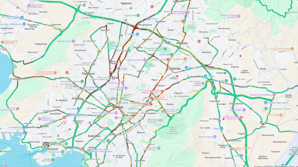 Η κίνηση είναι πολύ αυξημένη εκτός από τη λεωφόρο Κηφισού, και στα δύο ρεύματα, στη λεωφόρο Αθηνών, λεωφόρο Κηφισίας και λεωφόρο Μεσογείων.