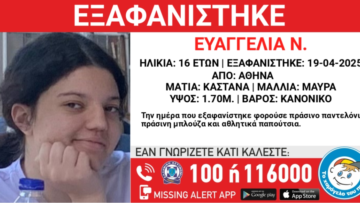 Σύμφωνα με το «Χαμόγελο του Παιδιού», η εξαφάνιση της Ευαγγελίας Ν. καταγράφηκε το απόγευμα της 19ης Απριλίου, ενώ ο Οργανισμός ενημερώθηκε σήμερα για το συμβάν και προχώρησε άμεσα στη δημοσιοποίηση των στοιχείων της, κατόπιν εισαγγελικής εντολής, καθώς ενδέχεται να συντρέχουν λόγοι που θέτουν τη ζωή της σε κίνδυνο.