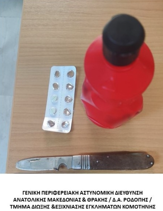 Άμεσα οι παραπάνω αστυνομικοί εντόπισαν και συνέλαβαν την δράστιδα στην κατοχή της οποίας βρέθηκαν και κατασχέθηκαν -2- ναρκωτικά δισκία, ένα -1- δοχείο υδροχλωρικού οξέος και -1- αναδιπλούμενο μαχαίρι.