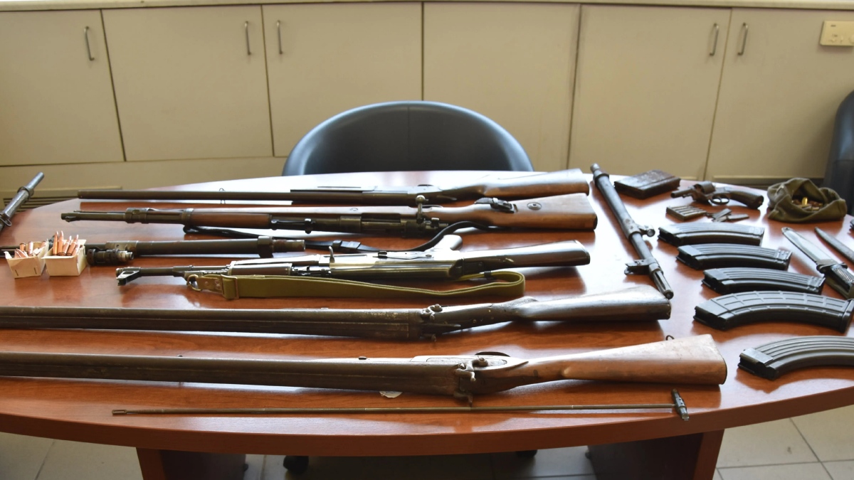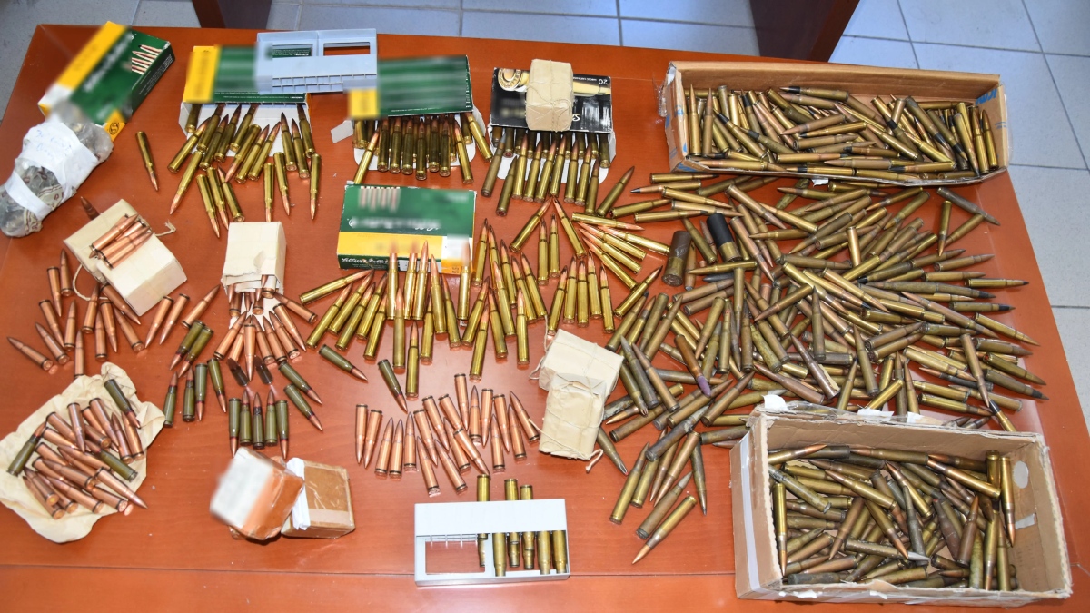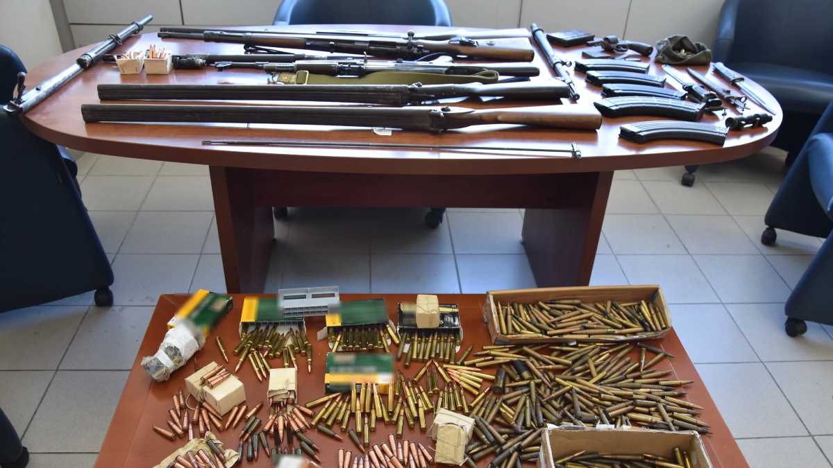 Εκεί, βρέθηκαν συνολικά: 2 πολεμικά όπλα, 3 κυνηγετικά όπλα, περίστροφο, 798 φυσίγγια, 42 κάλυκες, 6 βολίδες, 3 ξιφολόγχες, 11 γεμιστήρες, κορμός πολεμικού όπλου, 2 κάννες πολεμικών όπλων, διόπτρα και διάφορα εξαρτήματα όπλων.