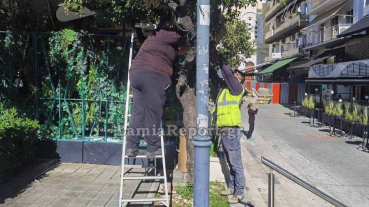 Κλήσεις στην υπηρεσία ηλεκτροφωτισμού του Δήμου Λαμιέων, οι υπάλληλοι της οποίας πήγαν στολίσουν την πλατεία, έκοψε η Τροχαία.