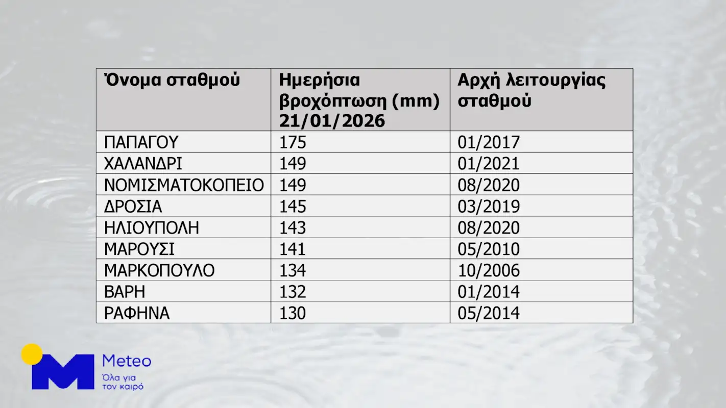 Όπως επισημαίνει το METEO/ΕΑΑ, σε αρκετές περιοχές της Αττικής τα ύψη βροχής που σημειώθηκαν την Τετάρτη 21 Ιανουαρίου 2026 ήταν τα μεγαλύτερα που έχουν καταγραφεί από την έναρξη λειτουργίας των αντίστοιχων σταθμών.