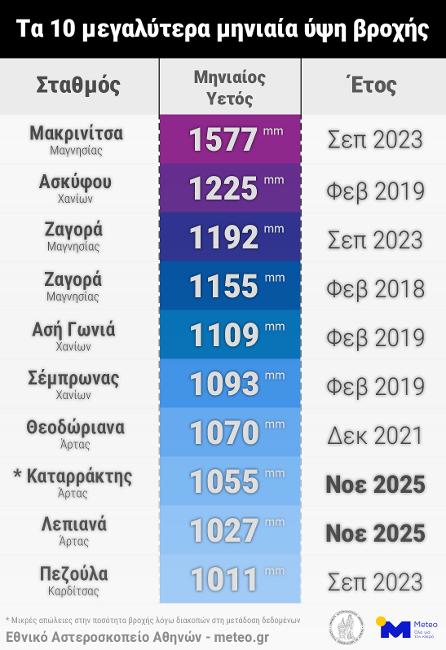 Το μεγαλύτερο μηνιαίο ύψος βροχής καταγράφηκε στον Καταρράκτη Άρτας, όπου σημειώθηκαν 1055 χιλιοστά, με ορισμένες μικρές απώλειες στην καταγεγραμμένη ποσότητα λόγω μικρών διακοπών στη μετάδοση δεδομένων.