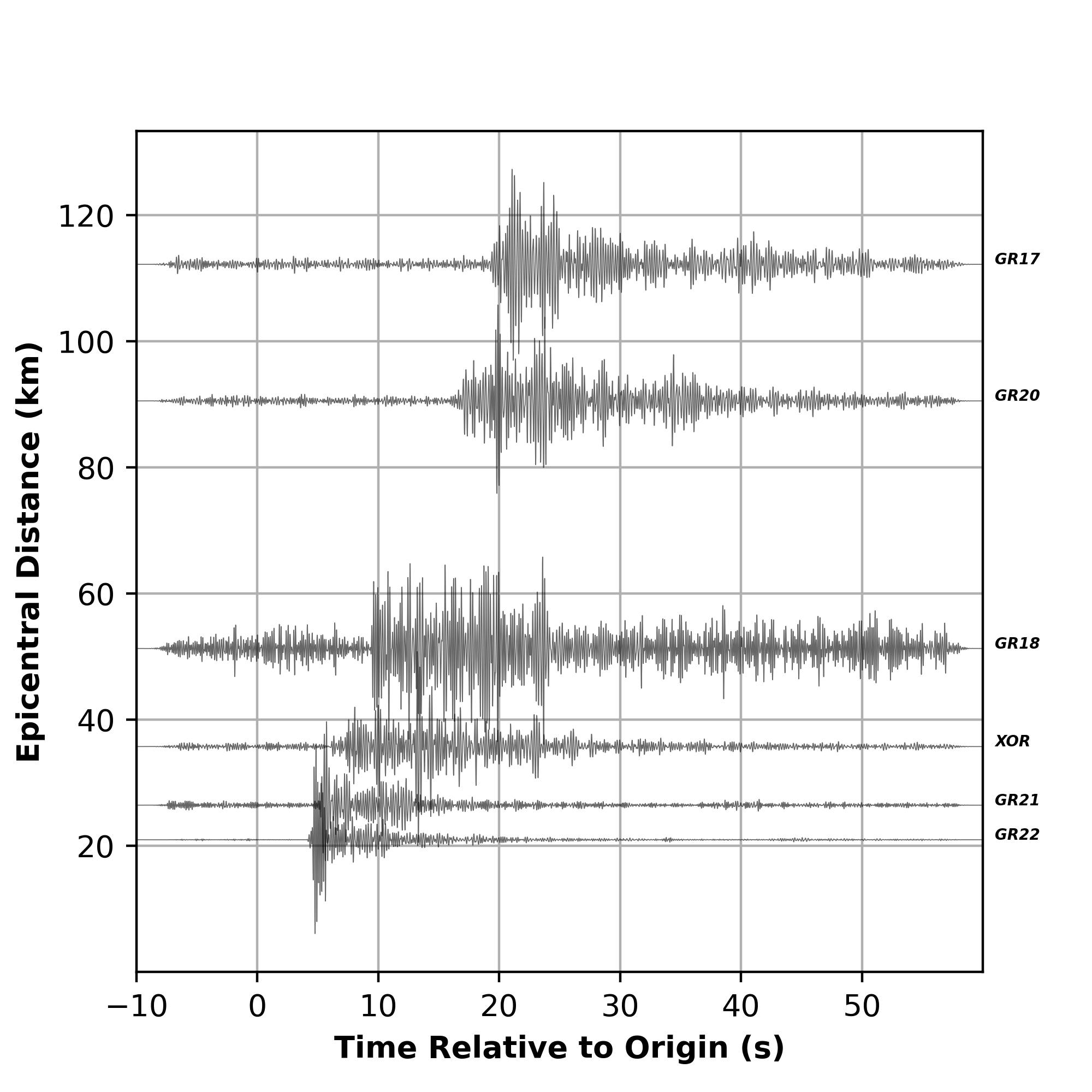 Διάφοροι σταθμοί κατέγραψαν το καταστροφικό γεγονός, με κοντινότερο αυτόν που βρίσκεται σε απόσταση 22 χιλιομέτρων, και μακρινότερο εκείνον που βρίσκεται σε απόσταση 112 χιλιομέτρων.