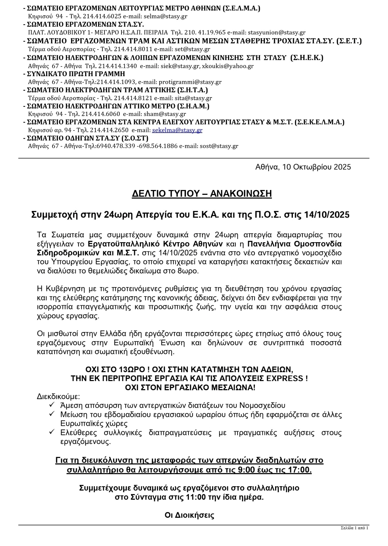 Την προκήρυξη 24ωρης απεργίας για την Τρίτη 14 Οκτωβρίου 2025 και απεργιακή συγκέντρωση στο Σύνταγμα, στις 11:00, αποφάσισε το Δ.Σ. του Εργατικού Κέντρου Αθήνας σε έκτακτη συνεδρίασή του, αντιδρώντας στο νέο εργασιακό νομοσχέδιο.