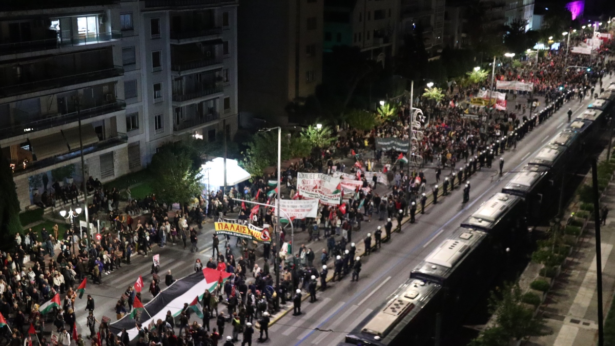 Η διοργάνωση της πορείας έκλεισε λίγο μετά τις 19.30 με την πυκνή και μαζική συγκέντρωση του ΚΚΕ, στην κεφαλή της οποίας της βρισκόταν ο ΓΓ του Κόμματος Δ.Κουτσούμπας. Το ΚΚΕ άπλωσε ένα μακρύ πανό με συνθήματα στο κράσπεδο του δρόμου μπροστά από την πρεσβεία.