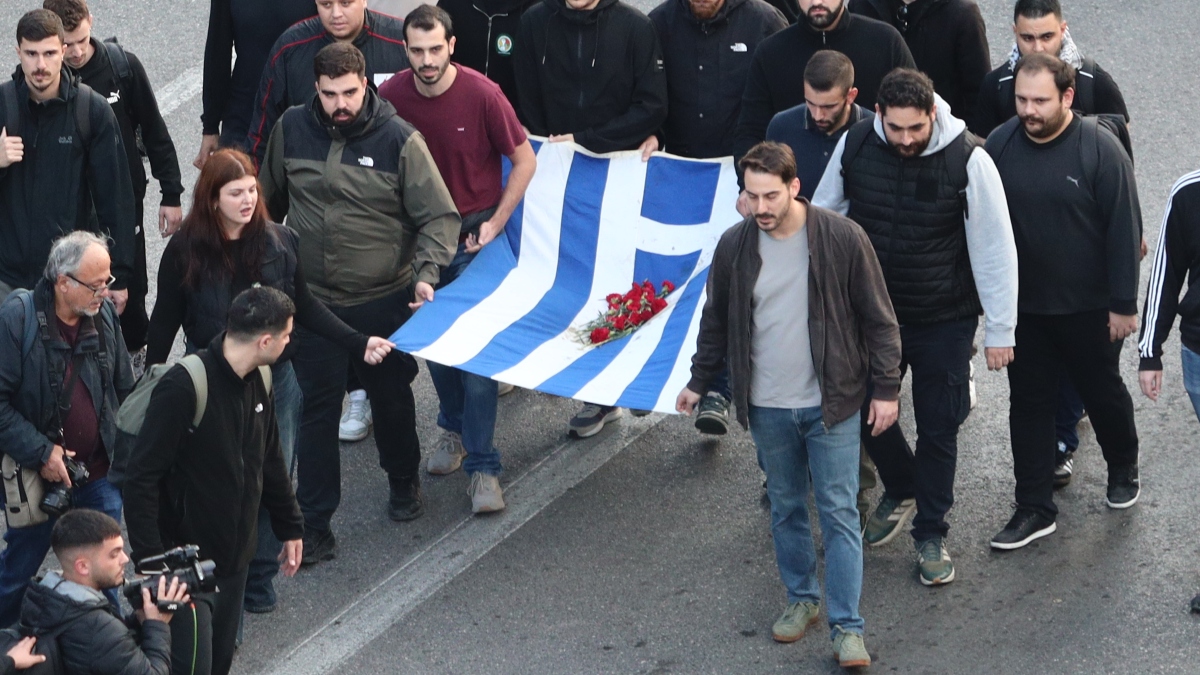 Μια συμβολική στάση μπροστά στο άτυπο μνημείο στο Σύνταγμα όπου είναι γραμμένα τα ονόματα των θυμάτων των Τεμπών έκανε το μπλοκ που μετέφερε την ιστορική σημαία του Πολυτεχνείου. Μπροστά από τη Λέσχη Αξιωματικών συμμετέχοντες στο μπλοκ έστρωσαν κόκκινα γαρύφαλλα μπροστά από τη διέλευση της σημαίας.