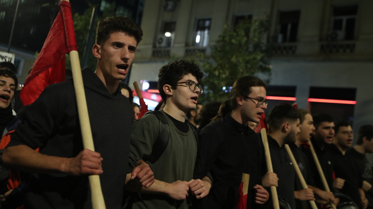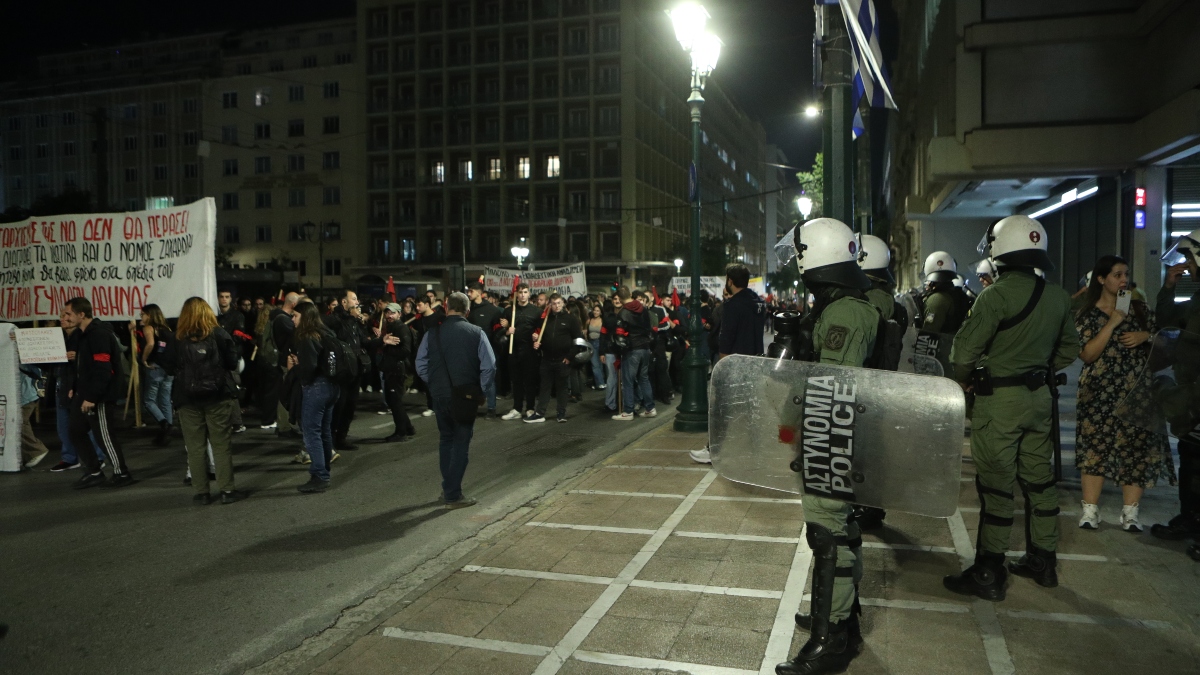 Προς το Σύνταγμα κατευθύνονται εκατοντάδες νεαρά άτομα, κρατώντας σημαίες και πανό, και φωνάζοντας συνθήματα.