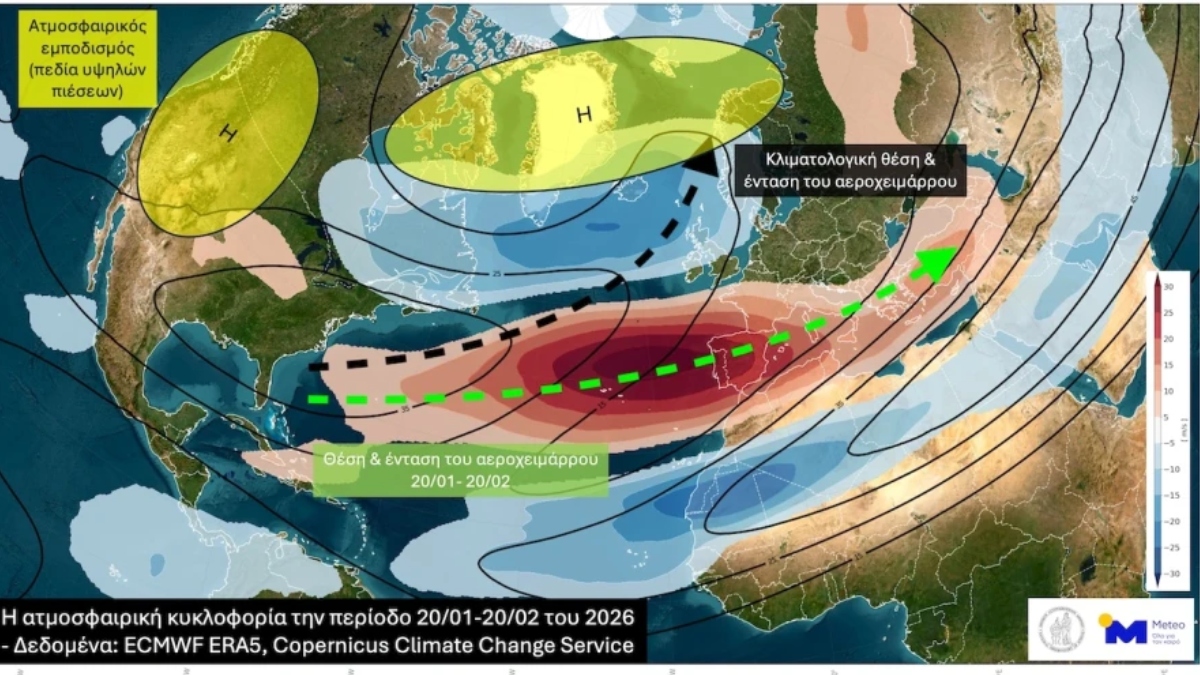 Η εικόνα δείχνει την ατμοσφαιρική κυκλοφορία την περίοδο 20/01-20/02 του 2026. Με μαύρες γραμμές αποτυπώνεται η κληματολογική μέση (αναμενόμενη) θέση και ένταση του αεροχειμάρρου για την ίδια περίοδο του έτους (20/01-20/02) με περίοδο αναφοράς τα έτη 1991-2020. Με κόκκινες και μπλέ αποχρώσεις αποτυπώνονται οι θετικές (πιο ισχυροί του κανονικού δυτικοί άνεμοι) και αρνητικές (λιγότερο ισχυροί του κανονικού δυτικοί άνεμοι) αποκλίσεις από την κλιματολογική μέση τιμή στην ένταση του ανέμου αντίστοιχα για το 2026.
