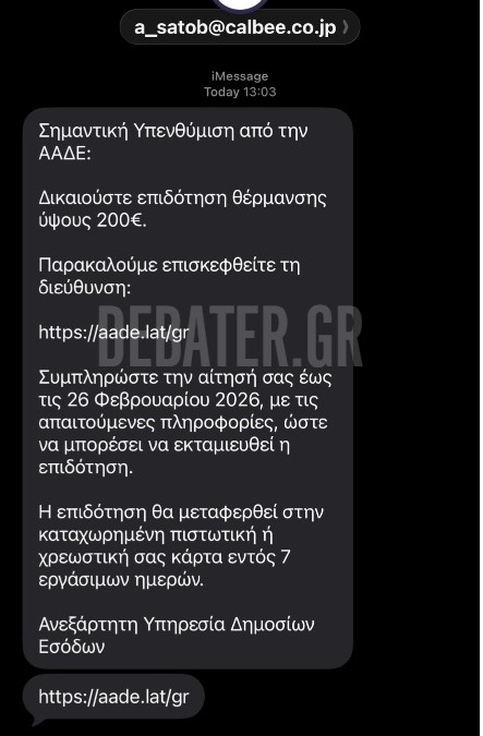 Σύμφωνα με καταγγελίες αναγνωστών, το επίμαχο μήνυμα εμφανίζεται ως «Σημαντική Υπενθύμιση από την ΑΑΔΕ» και αναφέρει ότι ο παραλήπτης «δικαιούται επιδότηση θέρμανσης ύψους 200€». Μάλιστα, καλεί τους πολίτες να επισκεφθούν έναν σύνδεσμο που μοιάζει με επίσημη ιστοσελίδα της ΑΑΔΕ, προκειμένου να συμπληρώσουν δήθεν αίτηση έως τις 26 Φεβρουαρίου 2026.