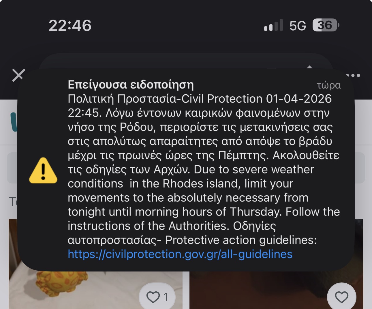 Οι κάτοικοι της Ρόδου έλαβαν στα κινητά τους προειδοποιητικό μήνυμα από το 112 προκειμένου να περιορίσουν τις μετακινήσεις τους στις απολύτως απαραίτητες από το βράδυ της Τετάρτης 1/4 μέχρι τις πρωινές ώρες της Πέμπτης 2/4.